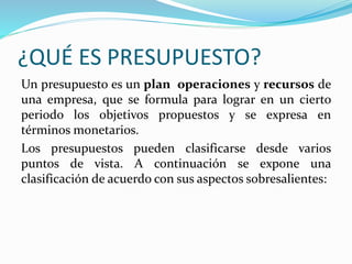 Este documento define qué es un presupuesto y describe diferentes tipos de presupuestos. Un presupuesto es un plan financiero que establece los objetivos y recursos de una empresa para lograr esos objetivos en un período determinado. Los presupuestos pueden clasificarse como rígidos o flexibles dependiendo de su capacidad de ajustarse a cambios, y también como presupuestos maestros o de corto/largo plazo dependiendo del período que cubren. El documento también discute los beneficios de los presupuestos como herramienta de plan