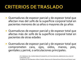 Este documento presenta los criterios para el envío de pacientes con quemaduras a un centro especializado en quemaduras. Algunos de los criterios incluyen quemaduras que afectan más del 10% de la superficie corporal en niños menores de 10 años o adultos mayores de 50 años, quemaduras que comprometen áreas especiales como la cara o las manos, quemaduras eléctricas o químicas, y pacientes con otras lesiones o enfermedades preexistentes. También se recomienda el envío de niños que requieren apoyo em