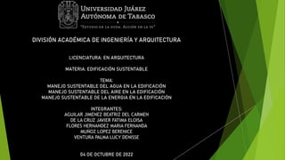 El documento aborda el manejo sustentable del agua, aire y energía en edificaciones, enfatizando la necesidad de estrategias que optimicen recursos y disminuyan el impacto ambiental. Se discuten certificaciones sostenibles como LEED y la importancia de diseños bioclimáticos para fomentar una construcción responsable y eficiente. Igualmente, se resalta la urgencia de implementar políticas efectivas y formar profesionales con conciencia ambiental en la arquitectura moderna.