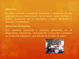 Este documento describe los diferentes tipos de desechos generados en centros de salud, incluyendo desechos comunes, potencialmente peligrosos, infecciosos, orgánicos y especiales. Explica que los desechos infecciosos son aquellos que pueden contener agentes infecciosos y los desechos orgánicos incluyen partes humanas o animales. También resume los requisitos para el almacenamiento y transporte adecuado de los diferentes tipos de desechos basados en su naturaleza.