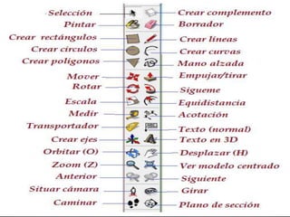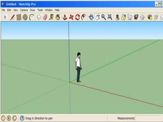 Sketchup es un programa de diseño y modelado 3D utilizado para proyectos de arquitectura, ingeniería y diseño. Se explican los pasos para descargar e instalar Sketchup, seleccionar una plantilla y comenzar a utilizar las herramientas básicas como dibujo, construcción, empujar/tirar y formas para crear un modelo 3D.