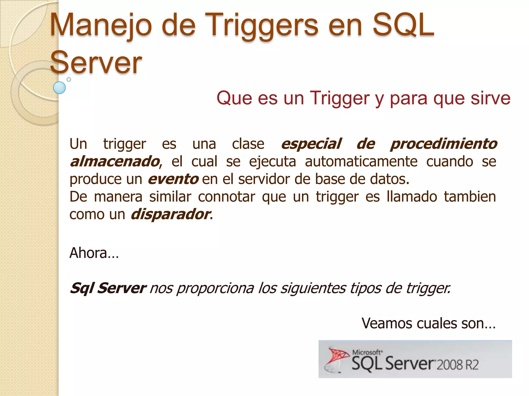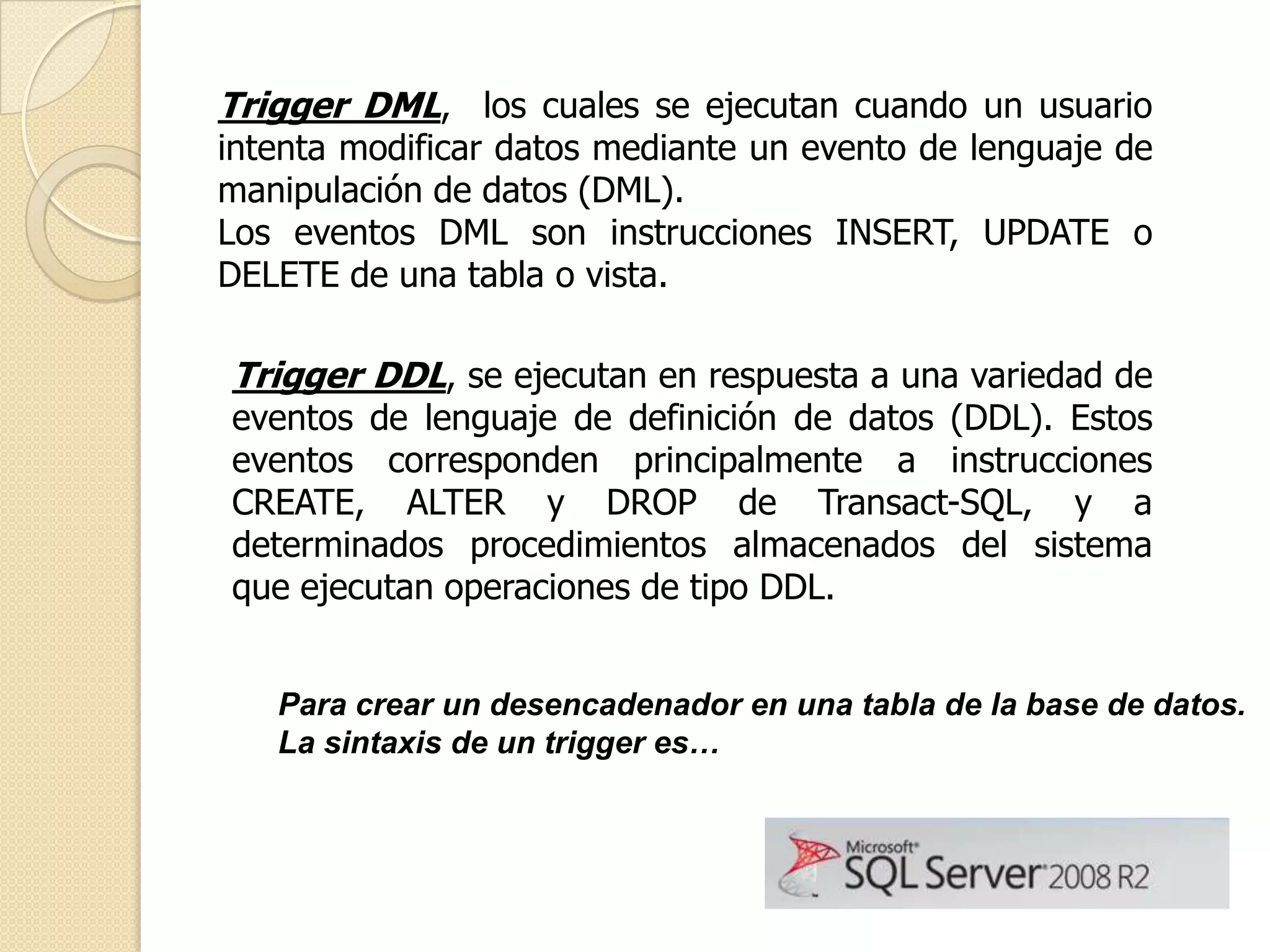 El documento describe los tipos de triggers en SQL Server, incluyendo triggers DML que se ejecutan ante la modificación de datos y triggers DDL que se ejecutan ante eventos de definición de datos. Explica cómo crear un trigger con la instrucción CREATE TRIGGER y muestra un ejemplo de un trigger que no permite la adición a una tabla equipo los fines de semana.