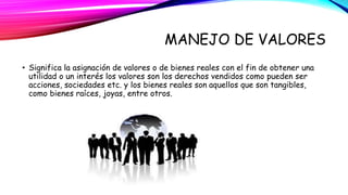 Este documento trata sobre varios temas relacionados con el manejo de valores y las políticas monetarias. Explica conceptos como el manejo de valores, políticas de pago y cobro, políticas de seguridad, formas de pago, la moneda, sistemas monetarios, divisas, dolarización, mercados libres y negros, devaluación y revalorización, y tasas representativas de cambio.
