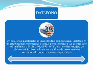 El documento describe cuatro herramientas para efectuar cobros: un datáfono o pasatarjetas que permite cobrar a clientes mediante tarjetas de crédito o débito a través de redes telefónicas o IP; un impresor que imprime cantidades en cheques; un detector de billetes falsos que diferencia billetes legítimos de falsos mediante tecnologías como ultravioleta e infrarrojo; e integrantes de un equipo.