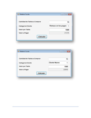 Este documento presenta 6 ejemplos de programas en Visual Basic 2010. Los ejemplos incluyen programas para calcular el área de un triángulo, determinar el valor a pagar de un artículo con IVA del 16%, calcular el salario de un trabajador con descuentos, determinar el cobro por gasolina en galones a litros, calcular el salario neto con descuentos y bonificaciones por hijos, y calcular el precio total para clientes de una empresa mayorista con diferentes descuentos según el tipo de cliente. Cada ejemplo incluye el có