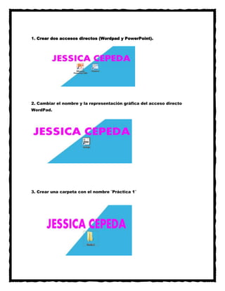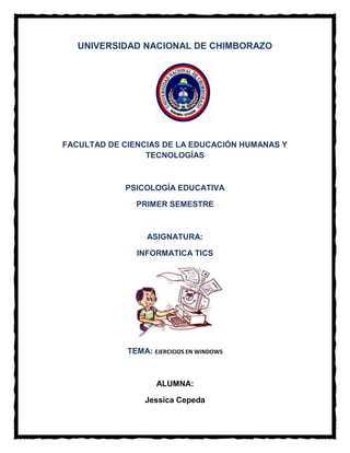 La estudiante Jessica Cepeda completó una serie de ejercicios en Windows como parte de su clase de Informática TICS en la Universidad Nacional de Chimborazo. Los ejercicios incluyeron crear accesos directos y carpetas, mover íconos entre carpetas, ordenar ventanas, configurar la barra de tareas y el protector de pantalla, y cambiar la resolución y configuración del escritorio.