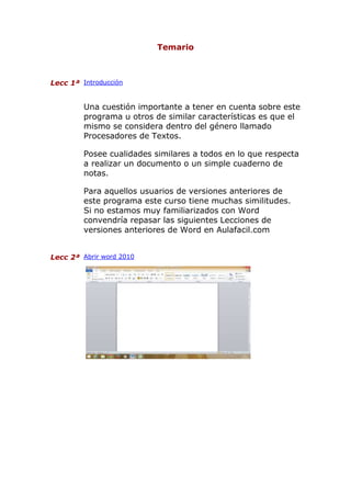 Este documento presenta un plan de estudios para un curso de introducción a Microsoft Word 2010. Contiene 41 lecciones que cubren temas como abrir y guardar archivos, formato de texto, tablas, imágenes, gráficos e inserción de otros objetos. La primera lección introduce Word como un procesador de texto y destaca similitudes con versiones anteriores. Se recomienda repasar lecciones de versiones anteriores para aquellos nuevos en Word.