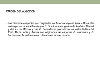 El algodón, originario de América tropical, Asia y África, es un cultivo global esencial que produce fibra para la industria textil y aceite vegetal de sus semillas. China lidera la producción mundial, mientras que en Venezuela el cultivo representa solo el 3% de la agricultura, con un énfasis en variedades de fibra media y técnicas de siembra únicas en vegas. A pesar de las oportunidades de mercado y la adaptabilidad del cultivo en condiciones agroecológicas diversas, la producción venezolana enfrenta desafíos como la baja rentabilidad y la alta dependencia de importaciones para satisfacer la demanda nacional.