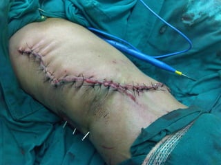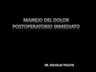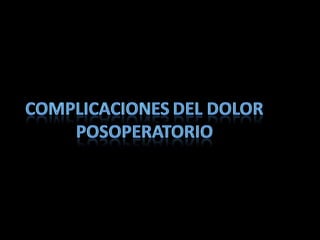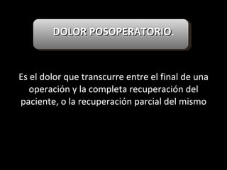 El documento habla sobre el dolor posoperatorio y su manejo. Describe factores que influyen en el dolor, escalas para medirlo, opciones de analgesia como AINEs, opioides y técnicas como peridural y PCA. Resalta la importancia de informar al paciente, usar analgésicos preoperatorios y una analgesia multimodal para prevenir y controlar eficazmente el dolor después de una cirugía.
