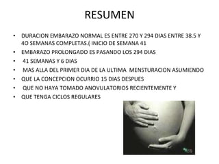 El embarazo prolongado se define como mayor a 42 semanas. Puede deberse a errores en las fechas o a factores como antecedentes maternos o falta de estimulo hipotalámico. Los riesgos incluyen mayor mortalidad y asfixia perinatal, macrosomía fetal y distocia de hombros. La evaluación incluye ecografía, pruebas de estrés y análisis de líquido amniótico. Se recomienda inducción a las 41-42 semanas para evitar complicaciones.