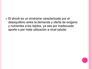 El documento habla sobre el manejo del paciente con shock. Explica que el shock es un síndrome caracterizado por el desequilibrio entre la demanda y oferta de oxígeno a los tejidos. Se clasifica el shock en 4 categorías: hipovolémico, cardiogénico, obstructivo y distributivo. Describe las manifestaciones clínicas, exploración física, exámenes complementarios y manejo inicial en sala de emergencias para cada tipo de shock.