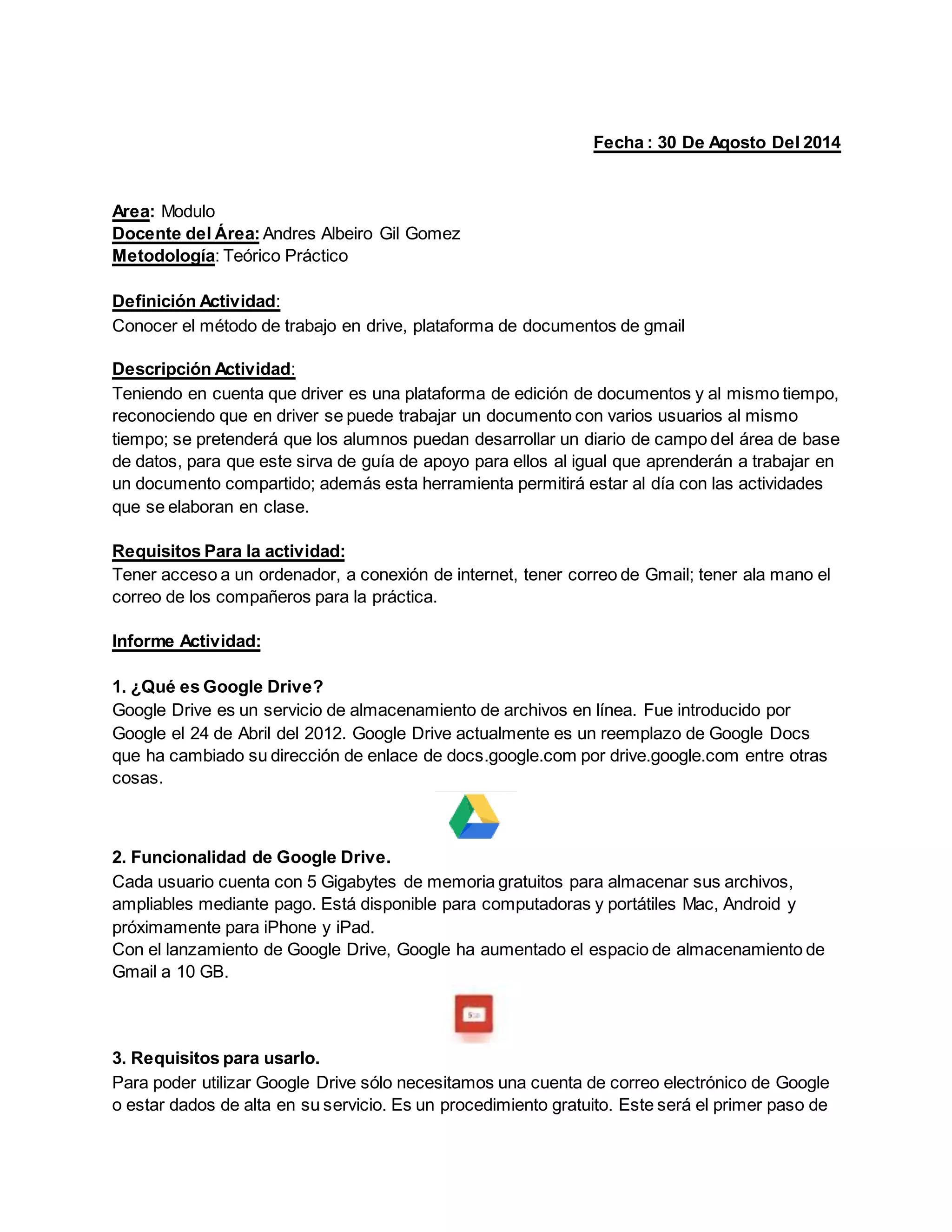 Este documento proporciona una introducción al uso de Google Drive. Explica que Google Drive es un servicio de almacenamiento en la nube que permite crear, editar y compartir documentos de forma colaborativa. Detalla los pasos para crear una cuenta de Gmail, acceder a Google Drive, crear y subir archivos, organizarlos en carpetas, y compartirlos con otros. También cubre cómo sincronizar archivos entre Drive y un ordenador local usando las aplicaciones de Drive.