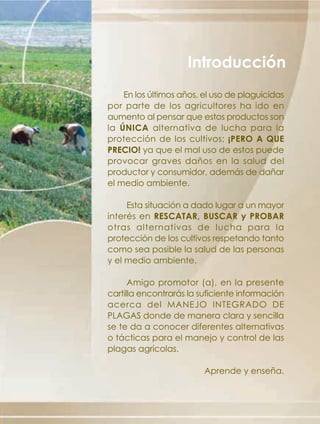 El documento aborda el aumento del uso de plaguicidas en la agricultura y sus implicaciones negativas para la salud y el medio ambiente, proponiendo el manejo integrado de plagas (MIP) como una solución alternativa. Se presentan diversas tácticas para el control de plagas, que incluyen métodos biológicos, microbiológicos, culturales, mecánicos, etológicos y químicos, buscando minimizar el uso de plaguicidas. Además, se enfatiza la importancia de la educación y la experimentación en el campo agrícola para mejorar la sostenibilidad y la salud de los cultivos.