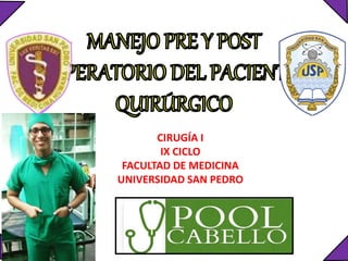Este documento resume los conceptos clave del preoperatorio, clasificación del riesgo quirúrgico y posoperatorio. En el preoperatorio se describen los exámenes necesarios y la historia clínica adecuada. Existen varias clasificaciones de riesgo quirúrgico según factores como la edad, condición del paciente y tipo de cirugía. Finalmente, el posoperatorio incluye los cuidados inmediatos y posibles complicaciones en los periodos temprano, medio y tardío.
