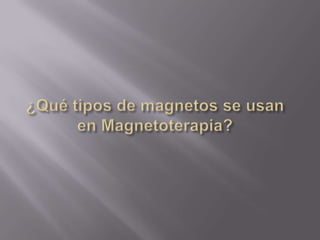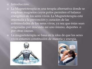 La magnetoterapia es una terapia alternativa que emplea imanes para balancear la energía de los seres vivos y tratar enfermedades. Se basa en la idea de que los seres vivos están compuestos de materia y energía. Ha sido utilizada desde la antigüedad por culturas como los chinos, egipcios y griegos, y se ha desarrollado más en los últimos siglos gracias al estudio del electromagnetismo. Actualmente se usa imanes para tratar dolencias musculares y se ha vuelto popular para aliviar problemas derivados del estr