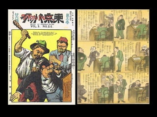 Kitazawa Rakuten se considera el primer autor de manga difundido en Occidente y el primero en autonombrarse como mangaka. Sus obras de principios del siglo XX publicadas en la revista Tokio Puck estuvieron influenciadas por la revista británica Puck e influyeron a ilustradores occidentales. El manga moderno se definió por la combinación de la tradición gráfica japonesa y las historietas occidentales, destacando la labor de Osamu Tezuka después de la Segunda Guerra Mundial.