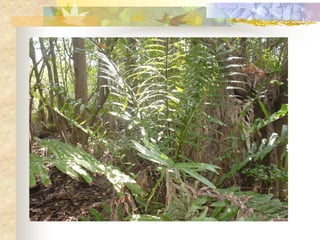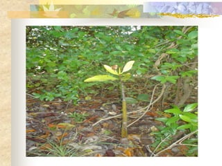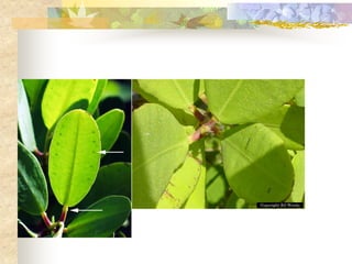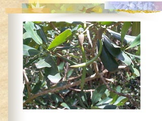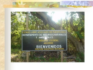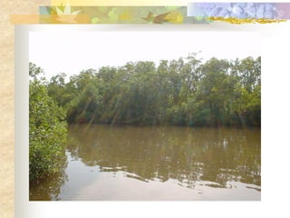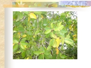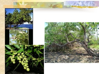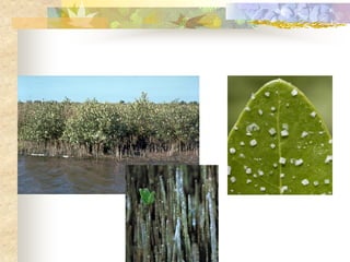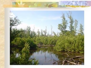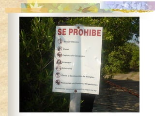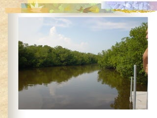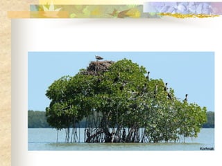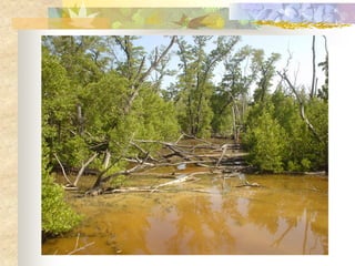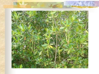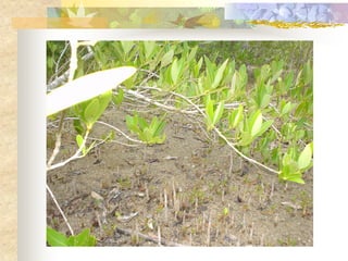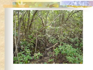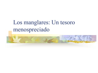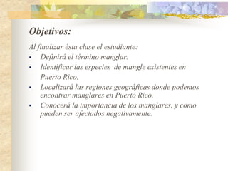 El documento define los manglares como árboles adaptados a terrenos anegados y salinos, e identifica cuatro especies de mangle en Puerto Rico (mangle rojo, mangle negro, mangle blanco y mangle botón). Explica las adaptaciones de cada especie y donde se encuentran. También describe la importancia ecológica y económica de los manglares, y cómo pueden verse afectados negativamente por drenaje, contaminación, tala y relleno de terrenos.