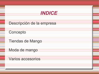 Este documento presenta la colección de moda primavera-verano de Mango. Describe a Mango como una empresa multinacional dedicada al diseño y venta de ropa y accesorios para mujeres. Explica que su concepto se basa en ofrecer productos de diseño propio y calidad a una imagen de marca coherente. Detalla que sus tiendas buscan transmitir un ambiente dinámico y armonioso. Finalmente, promociona sus looks para la próxima temporada basados en blazers, cazadoras de cuero y varios acces