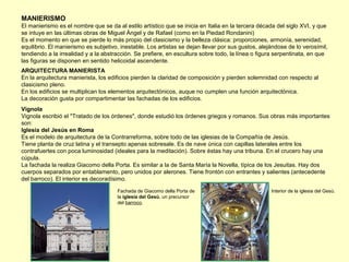 El documento resume los principales elementos del manierismo en arquitectura, pintura y escultura en Italia durante el siglo XVI. En arquitectura, el manierismo se caracteriza por la multiplicación de elementos decorativos y la pérdida de claridad y solemnidad del clasicismo. Andrea Palladio y Vignola fueron arquitectos manieristas destacados. En pintura, artistas como Correggio, Parmigianino y en escultura, Cellini, Juan de Bolonia y los Leoni representan el estilo manierista a través de figuras serpentinadas y col