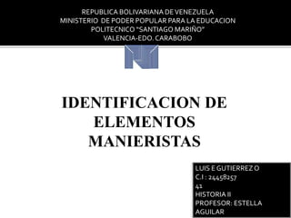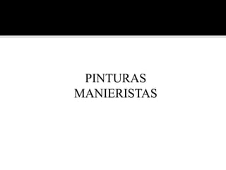 El manierismo en pintura se caracterizó por figuras alargadas y posturas precarias, atención meticulosa a los detalles y uso de colores irracionales y luces teatrales. En escultura, se exageraron las proporciones humanas y se mostraron emociones intensas. La arquitectura manierista alteró las proporciones clásicas con vanos curvos, dobles columnas y juegos de luces y sombras.