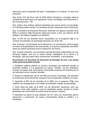 La carta resume una reunión de la Institución Educativa República de Argentina (IERA) sobre el uso de tecnologías de comunicación en la educación. La carta recomienda que el gobierno establezca políticas para apoyar la ciencia y tecnología, asigne el 5% del PIB para investigación, capacite a más maestros en el uso de TIC, provea equipos digitales a las aulas, e incorpore las TIC en los planes de estudio para que los estudiantes puedan investigar e innovar.
