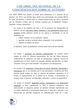 El documento habla sobre el Día Mundial de la Concienciación sobre el Autismo y resume la declaración de las Naciones Unidas de 2007 que estableció esta fecha. Luego describe cómo, casi 10 años después, los derechos de las personas con autismo y sus familias siguen sin ser respetados en muchas áreas como educación, empleo e intervención temprana. El gobierno autonómico ha recortado apoyos y servicios clave a pesar de la alta prevalencia de trastornos del espectro autista.
