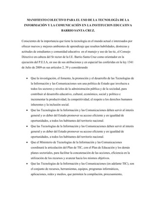 Este documento presenta un manifiesto colectivo para el uso de la tecnología de la información y la comunicación en una institución educativa. Reconoce la importancia de la tecnología en el mundo actual y propone ofrecer nuevos ambientes de aprendizaje que aprovechen las habilidades de estudiantes y comunidad educativa en el manejo de las TIC. Hace recomendaciones como planear clases usando herramientas tecnológicas, reestructurar planes de área, crear manuales de uso, mantener equipos, capacitar