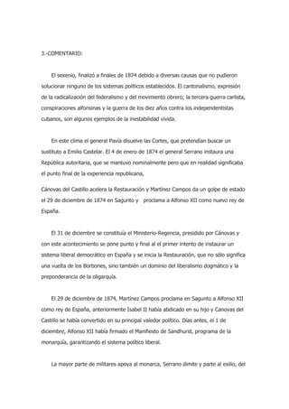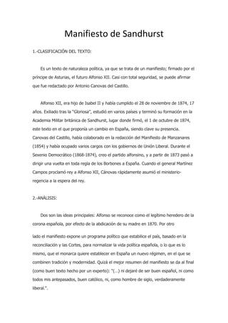 El Manifiesto de Sandhurst fue firmado por Alfonso XII el 1 de octubre de 1874 mientras estudiaba en la Academia Militar británica de Sandhurst. En él, Alfonso se reconoció como el legítimo heredero de la corona española y expuso un programa político para estabilizar España basado en la reconciliación, las Cortes y un régimen que combinara tradición y modernidad. Pocos meses después, el general Martínez Campos proclamó a Alfonso XII como nuevo rey de España, dando inicio a la Restauración borb