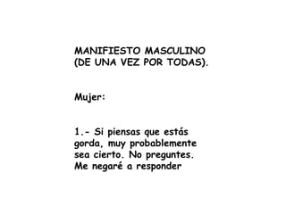 Este documento presenta un "Manifiesto Masculino" con 21 declaraciones sobre la supuesta simplicidad de los hombres y sus preferencias. Afirma que los hombres son simples, les gusta el sexo, el deporte y la carne asada los domingos, y no disfrutan de ir de compras o hablar de sentimientos. Pide que las mujeres entiendan mejor a los hombres aceptando respuestas directas y creyendo lo que dicen.