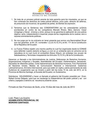 Los 7 acusados expresan su preocupación por las violaciones a sus derechos durante el proceso judicial en su contra. Señalan que no se ha garantizado un juicio justo e imparcial y temen recibir una sentencia condenatoria por motivos políticos más que por razones legales. Piden solidaridad a organizaciones de derechos humanos y gobiernos para que vigilen la audiencia programada para el 15 de julio, y solicitan al gobierno ecuatoriano que garantice la independencia del poder judicial en el caso.