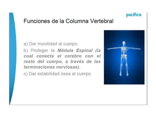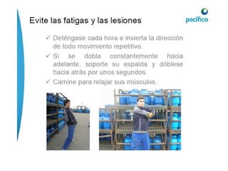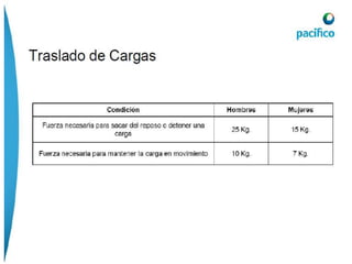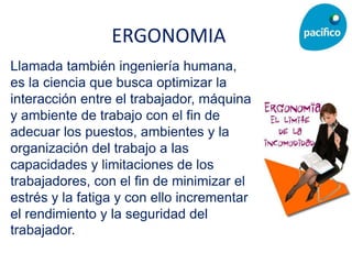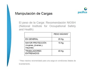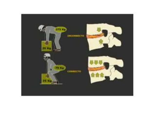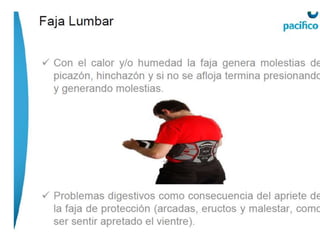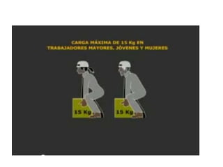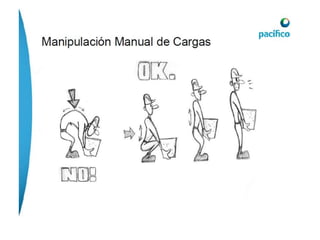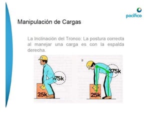 El documento habla sobre la ergonomía y la manipulación manual de cargas. Explica que la ergonomía busca optimizar la interacción entre el trabajador, la máquina y el ambiente de trabajo para adecuarlos a las capacidades humanas. Define la manipulación manual de cargas como cualquier operación de transporte o sujeción de una carga que puede representar riesgos para la salud de los trabajadores. Finalmente, discute los riesgos de usar fajas lumbares y concluye que no hay evidencia científica de que prevengan lesiones