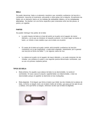 El documento describe las partes de una manivela y una biela, elementos mecánicos que transmiten movimiento. Una manivela consiste en una barra con un extremo fijo y otro que gira, y se usa para hacer girar ejes o ruedas. Tiene un eje, brazo y empuñadura. Una biela transmite movimiento entre piezas sometidas a fuerza, como en motores, y conecta el pistón con el cigüeñal. Está formada por la parte trasera, el cuerpo y la cabeza. El sistema biel