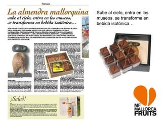 El documento habla sobre la fruta Manjaria. Se cultiva en Mallorca y puede usarse de diversas maneras: como fruta fresca, en museos, e incluso puede transformarse en bebida deportiva.