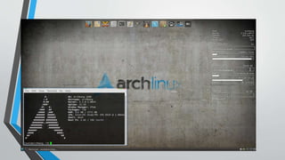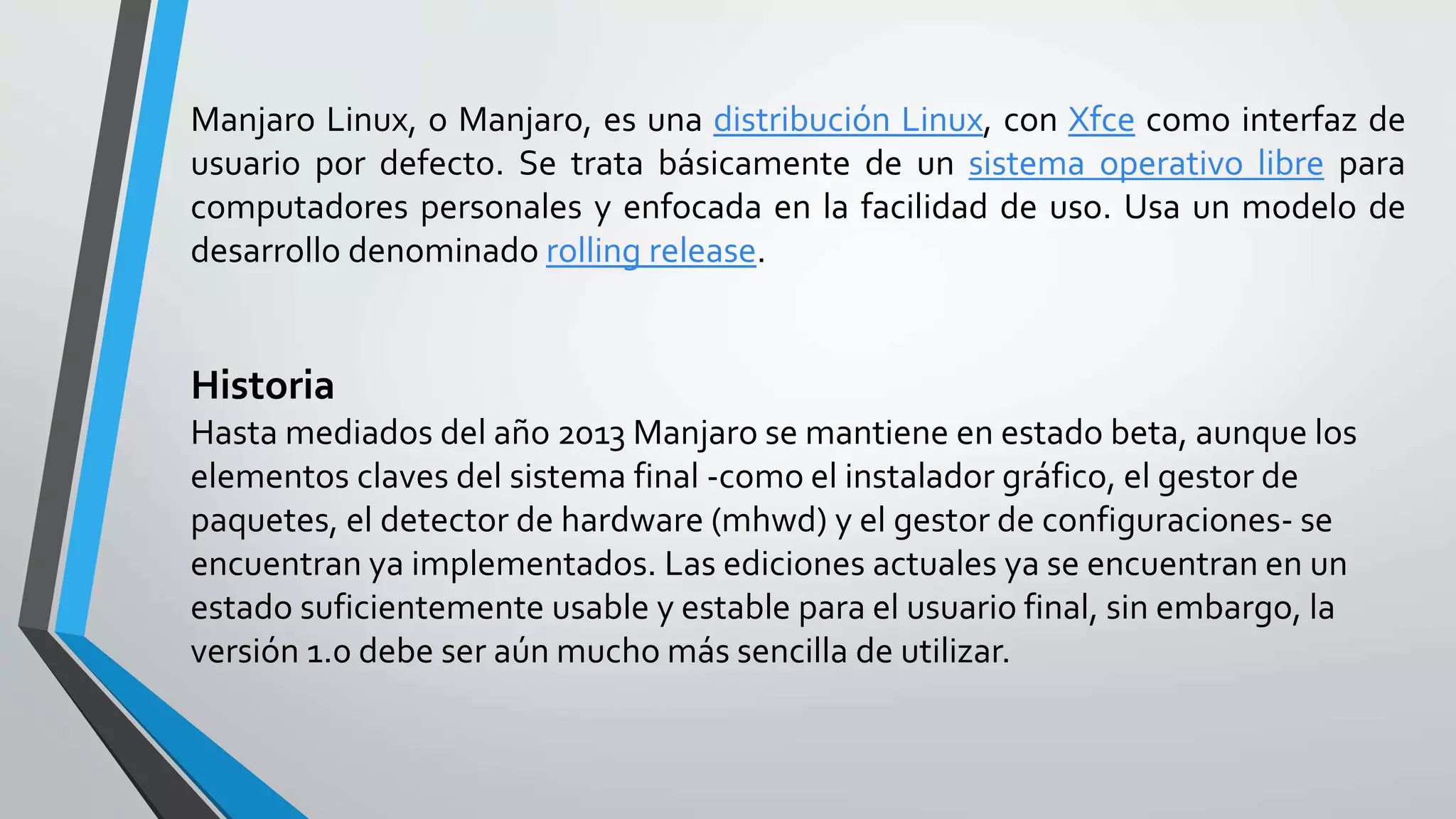 Manjaro Linux es una distribución Linux basada en Arch Linux que utiliza Xfce como interfaz de usuario predeterminada. Usa un modelo de lanzamiento continuo para mantener los paquetes actualizados. Al igual que Arch Linux, usa el gestor de paquetes pacman para instalar y actualizar software de forma sencilla.