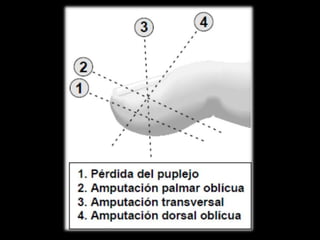 1) El documento describe las lesiones traumáticas de la mano, incluyendo su clasificación, exploración e implicaciones.