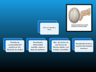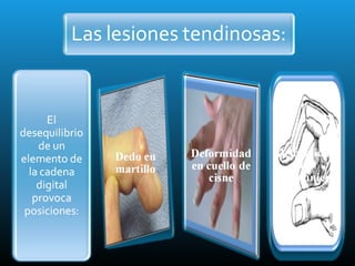 Este documento presenta información sobre la anatomía y el tratamiento de lesiones de los tendones extensores de la mano. Describe las causas comunes de estas lesiones, como la degeneración y los traumatismos, así como los síntomas como dolor, debilidad y limitación de la movilidad. Explica que el tratamiento puede ser conservador o quirúrgico, y proporciona detalles sobre el protocolo de rehabilitación posoperatoria, incluidas las etapas de protección y recuperación de la función.