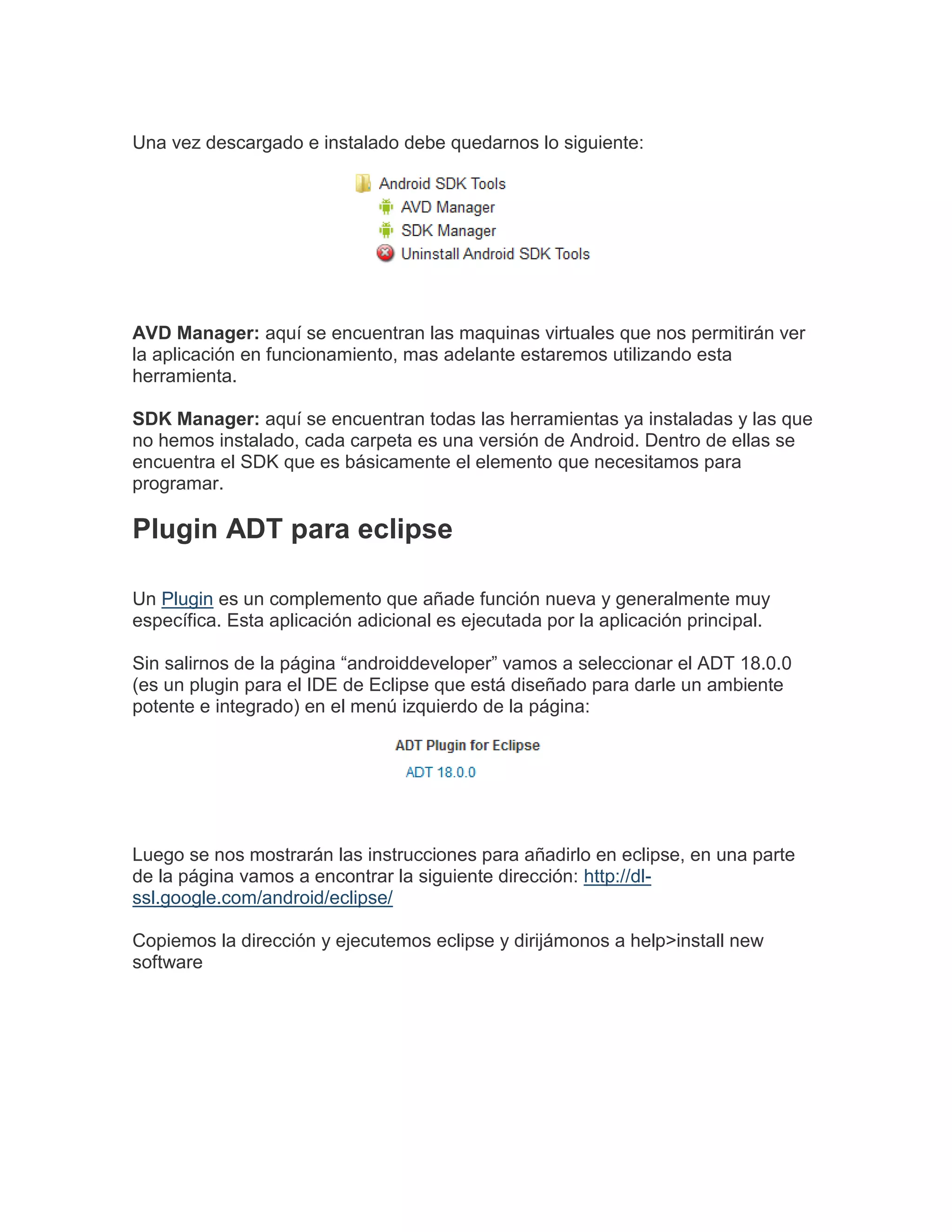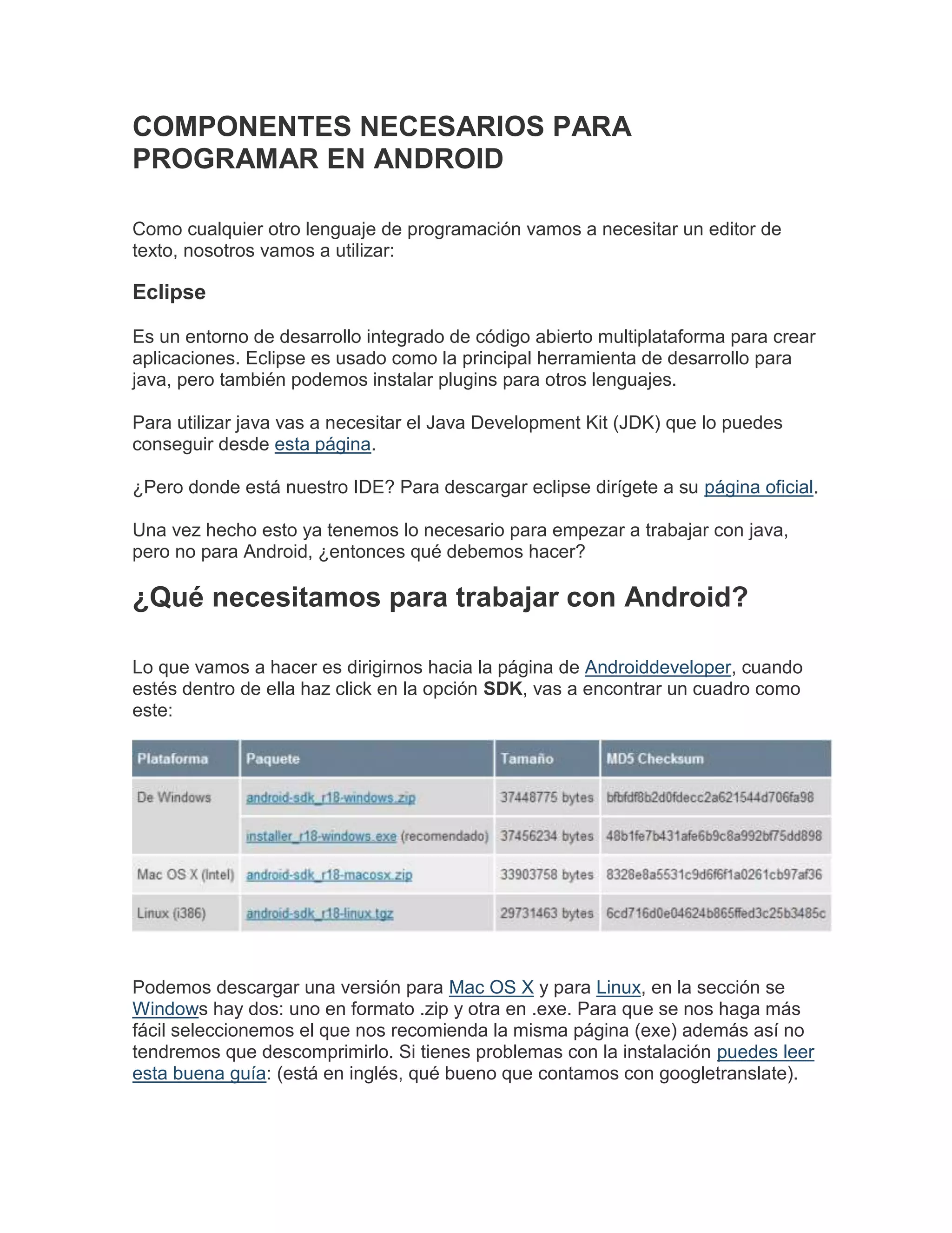 Los componentes necesarios para programar en Android incluyen Eclipse como IDE, el JDK, el SDK de Android descargado de la página de desarrolladores de Android, y el plugin ADT para Eclipse. Una vez instalados estos componentes, se puede crear un dispositivo virtual y un simple programa "Hola Mundo" en Android usando TextView.