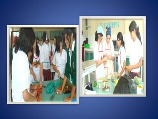 El documento presenta los trabajos realizados por alumnas de séptimo, octavo y noveno grado en diferentes áreas como corte y confección, manualidades y nutrición. Se elaboraron pantalones buzos, piñatas, compota de manzana, refresco de naranja y zanahoria. También se hicieron colchas, guantes y delantales para donar a asilos y hogares. El documento agradece a Dios, los padres y la directora por su apoyo.