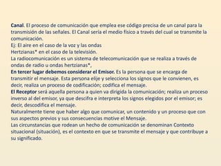 La comunicación implica la transmisión de información de un emisor a un receptor a través de un canal. Requiere un emisor que envía un mensaje, un receptor que lo recibe, y posibles ruidos que pueden interferir. La retroalimentación permite al emisor conocer la reacción del receptor sobre el mensaje.