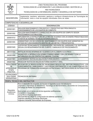 Este documento presenta la descripción del programa de formación Tecnólogo en Mantenimiento de Equipos de Cómputo, Diseño e Instalación de Cableado Estructurado del SENA. El programa tiene una duración de 24 meses y busca formar técnicos capacitados para realizar mantenimiento de equipos de cómputo, diseñar e instalar redes de cableado estructurado. El documento describe los objetivos, competencias, habilidades y conocimientos que los estudiantes desarrollarán como parte del programa.