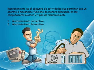 El documento describe dos tipos de mantenimiento de computadoras: mantenimiento correctivo y preventivo. El mantenimiento correctivo implica reparar la computadora cuando falla mediante el cambio o ajuste de piezas. El mantenimiento preventivo incluye limpiezas y revisiones programadas cada seis meses para prevenir problemas y reemplazar piezas antes de que fallen. Además, se proporcionan instrucciones detalladas para realizar la limpieza interna de una computadora de escritorio o torre, incluyendo los elementos y herramientas necesarios así como los pasos