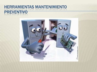 El documento describe diferentes herramientas de mantenimiento preventivo para electrónica como pinzas curvas, cautín para soldar, atornillador de pala o cruz, extractor de soldadura, pulsera antiestática, multímetro digital y analógico. También incluye consejos para mantener actualizado el sistema operativo, drivers, software y antivirus de una computadora.