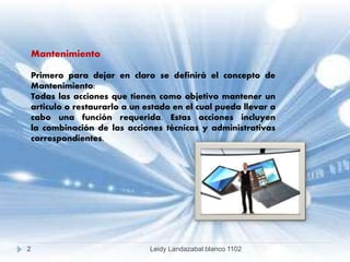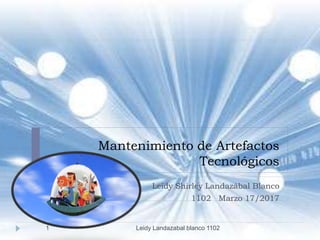 El documento describe los diferentes tipos de mantenimiento de artefactos tecnológicos como computadoras. Explica que el mantenimiento preventivo debe realizarse periódicamente para prevenir fallas y que el mantenimiento correctivo se lleva a cabo cuando ya ha ocurrido una falla. También recomienda limpiar regularmente la computadora eliminando archivos y programas innecesarios para liberar memoria y mejorar el rendimiento.