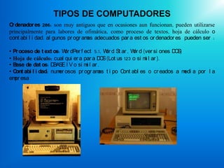 Este documento presenta información sobre los diferentes tipos de computadores y sus componentes. Describe computadores como los 286, 386, 486 y Pentium, así como computadoras portátiles y de escritorio. Explica los componentes externos como el monitor, teclado y ratón y cómo desconectarlos. También habla sobre las tarjetas de video como CGA, EGA, VGA y sus funciones.