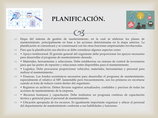 Este documento describe las diferentes etapas del sistema de gestión de mantenimiento. La planificación incluye el desarrollo de planes de mantenimiento basados en acciones previas y la comunicación con otras funciones. La programación programa periódicamente las actividades determinadas en los planes. La ejecución implementa el plan anual de mantenimiento para garantizar la disponibilidad y continuidad operativa. La supervisión y control identifica desviaciones para orientar la gestión de mantenimiento y mejorar el desempeño a través de indicadores.