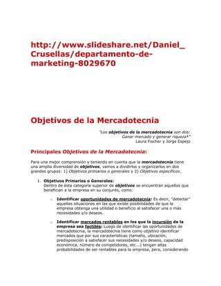 Este documento describe los objetivos generales y específicos del departamento de mercadotecnia de una empresa inmobiliaria. Los objetivos generales incluyen posicionar las marcas de la empresa, desarrollar estrategias de comunicación interna y externa, y planificar los presupuestos anuales de marketing. El departamento también se enfocará en consolidar una red de proveedores externos de servicios de diseño, investigación de mercados, producción y medios.