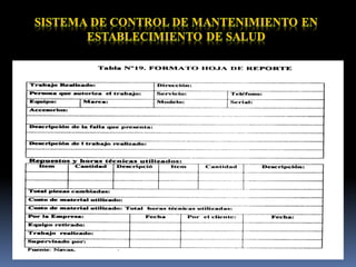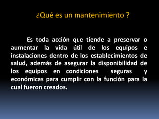 El documento define el mantenimiento como la actividad dedicada a garantizar y conservar la calidad del servicio que prestan los equipos, máquinas e instalaciones en condiciones seguras y económicas para cumplir con su función. Explica que existen tres tipos de mantenimiento: predictivo, preventivo y correctivo. Además, clasifica los equipos biomédicos según su riesgo para la salud de los pacientes y describe los aspectos de seguridad eléctrica que deben cumplir.