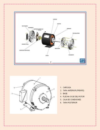 Este proyecto involucra desbobinar y rebobinar el motor monofásico de una lavadora. El estudiante aprenderá las partes y funcionamiento de un motor monofásico, y aplicará este conocimiento para desmontar, rebobinar y volver a ensamblar el motor siguiendo un diagrama de bobinas. El proyecto incluye una sección de marco teórico sobre motores eléctricos y una lista de materiales necesarios para completar el trabajo.