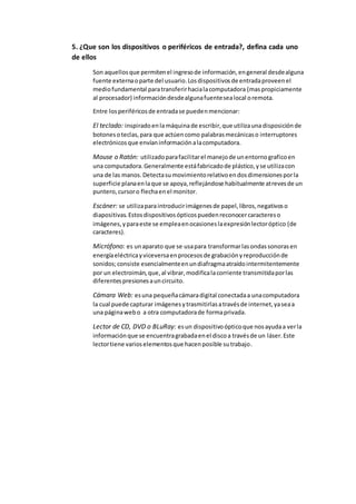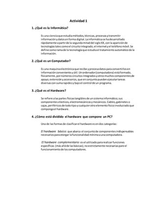 Este documento proporciona información sobre conceptos básicos de informática. Explica que la informática es la ciencia que estudia los métodos para procesar y transmitir información digitalmente. Define un computador como una máquina electrónica que procesa datos para convertirlos en información útil. Describe el hardware como las partes físicas de un sistema informático y el software como los componentes lógicos. Además, detalla diferentes tipos de periféricos de entrada, salida y almacenamiento, y define un sistema operativo como el programa que gestiona los