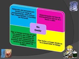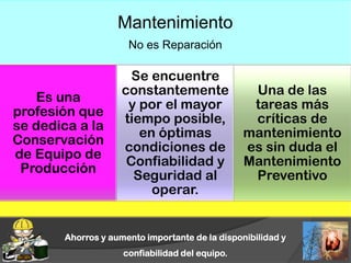 Este documento describe diferentes tipos de mantenimiento, como el mantenimiento correctivo, que ocurre después de una falla, el mantenimiento preventivo planificado, y el mantenimiento predictivo que monitorea la condición de la maquinaria. También discute los objetivos del mantenimiento como maximizar la vida útil de los equipos y minimizar costos. Además, enfatiza la importancia de la planificación, colaboración y mejora continua en la gestión del mantenimiento.